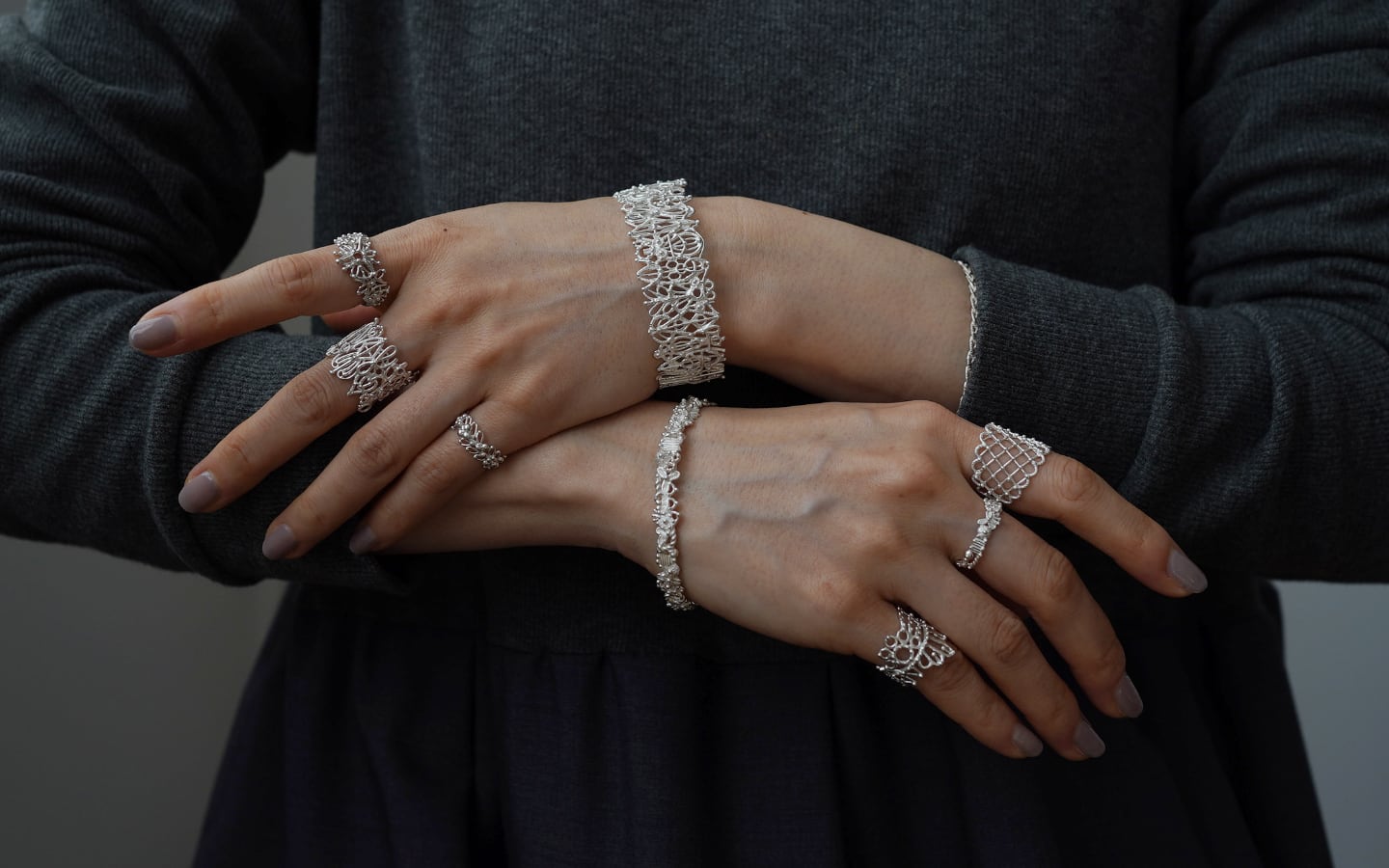 自然界の現象、深海の微生物、ミクロの世界-----自分を取り巻く様々な世界をシルバーのラインで、繊細に質感豊かに表現