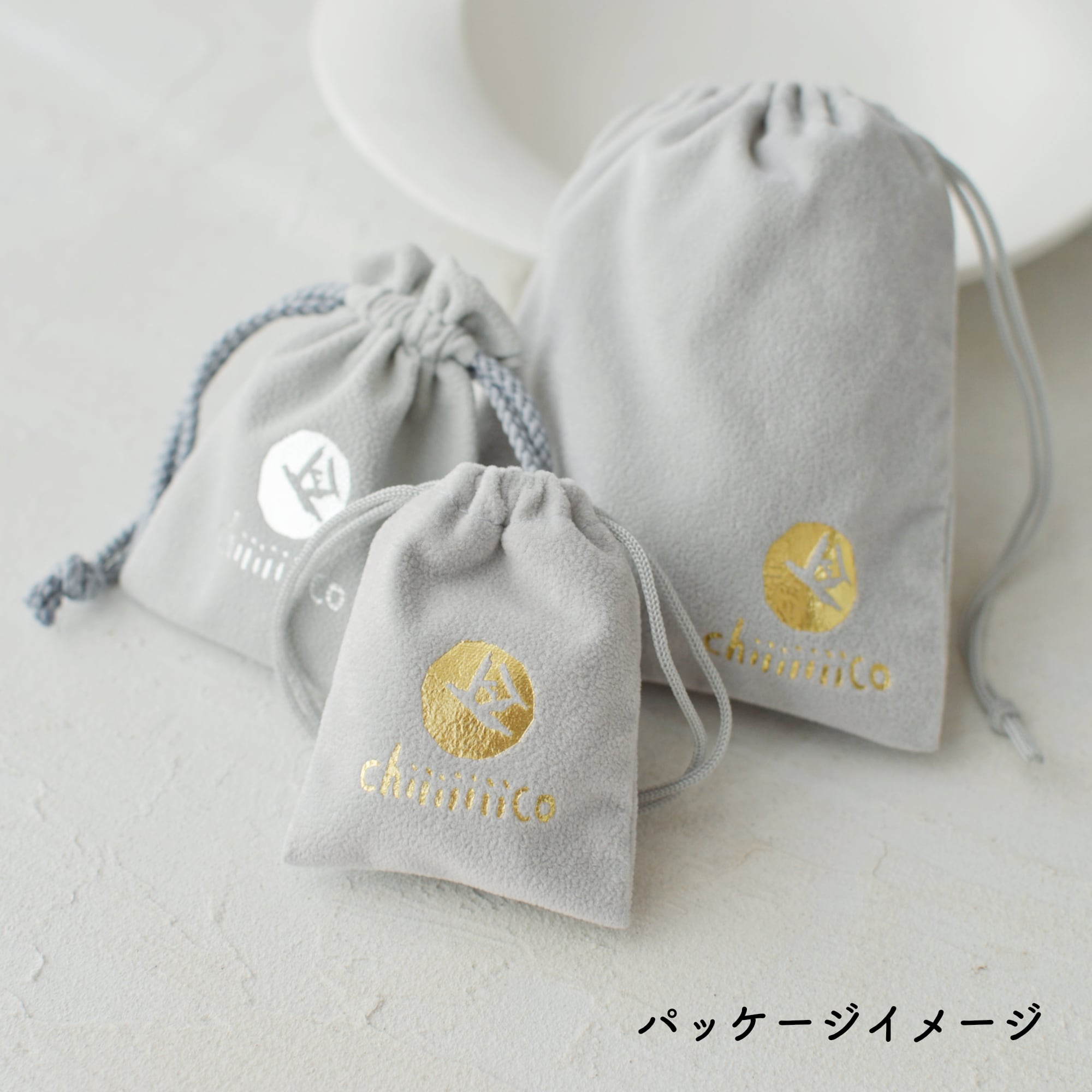 セーム調のグレー色の生地に、ゴールドまたはシルバーでchiiiiiiicoロゴが箔押しされた可愛いポーチにお入れします。そのままプレゼントにもどうぞ◎