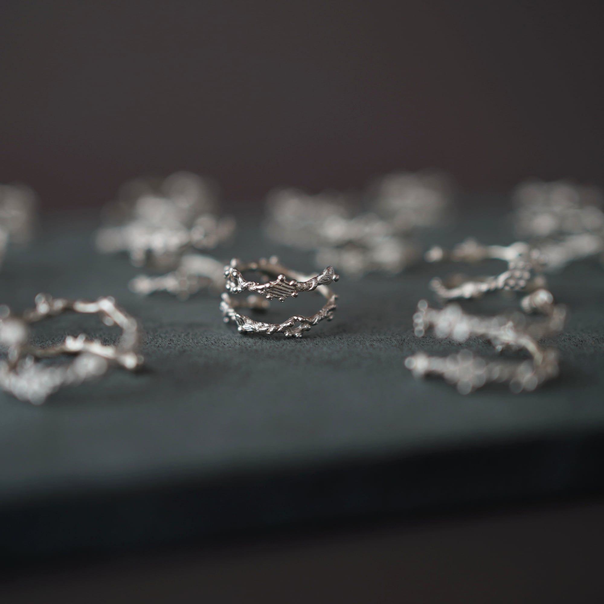 深海の微生物をイメージしたモチーフが螺旋状に並ぶフリーサイズのリングです。